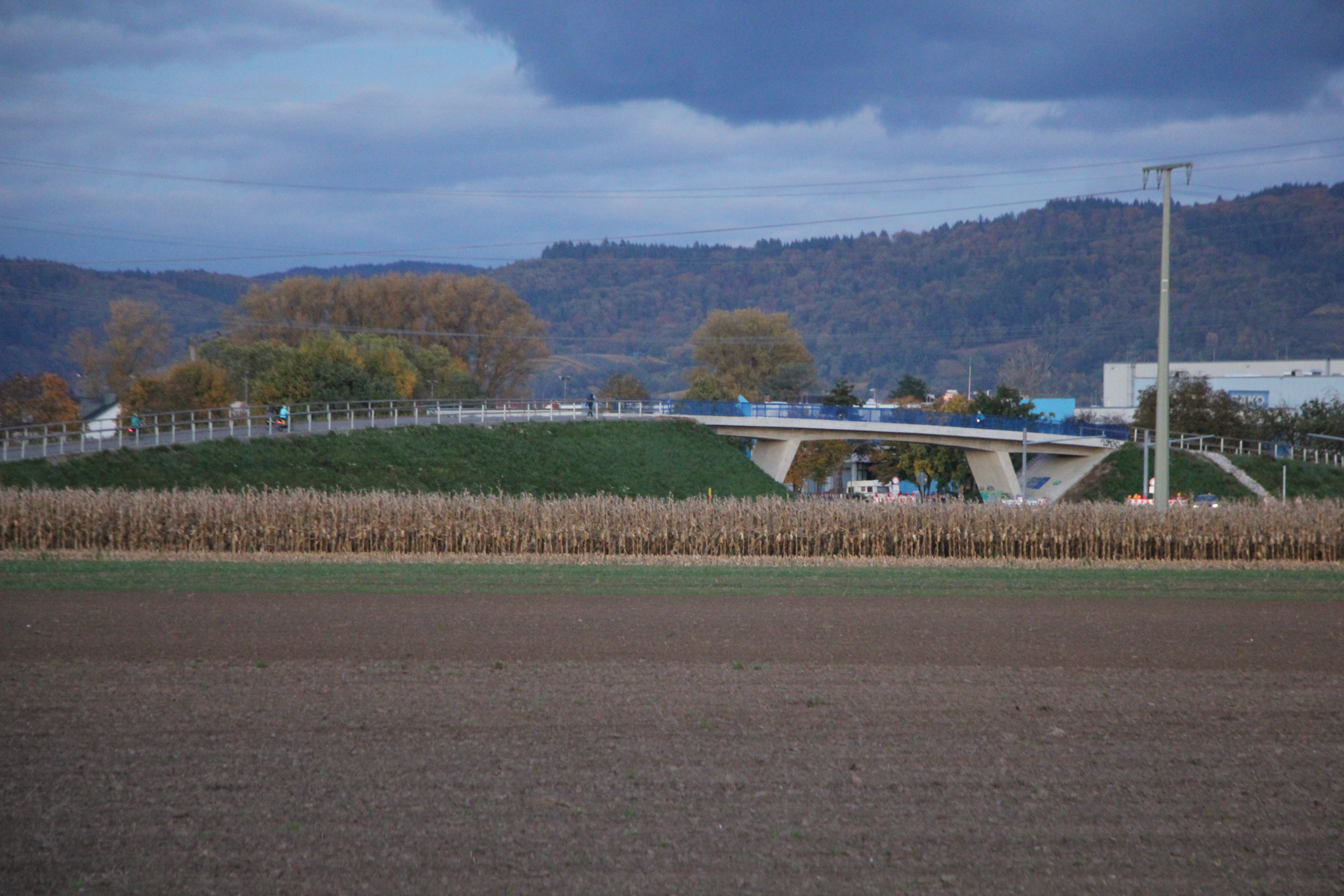Bei der Fahrt vorbei an der Bebauung wurden auch Neubauten festgestellt. Hierzu war zu bemerken, dass die Gemeinde durch eine Satzung den Neubau von Häusern ausschloss, alte kleine Häuser jedoch adäquat ausgebaut werden dürfen. Auf der alten schmalen Straße nach Neckarhausen lag eine neue Brücke vor uns. Diese neue Brücke führt die Anlieger über die neue Trasse der L 597, der Auffahrt zur neuen Neckarbrücke nach Ladenburg oder zur BAB Seckenheim. Die Kreisstraße zwischen Seckenheim und Neckarhausen wird gerade zurückgebaut.